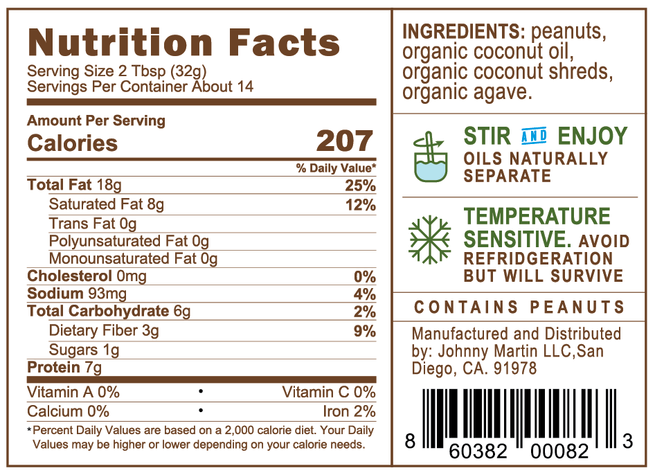 INGREDIENTS: roasted peanuts, organic coconut oil, organic coconut shreds, organic agave