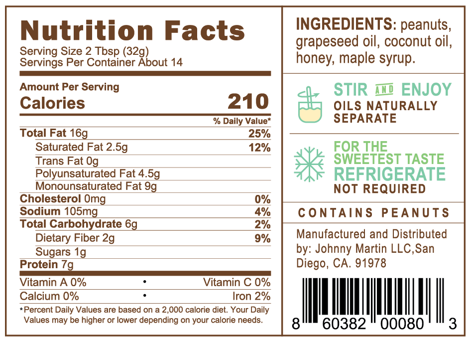 INGREDIENTS: roasted peanuts, non-GMO grapeseed oil, organic coconut oil, raw honey, pure maple syrup.